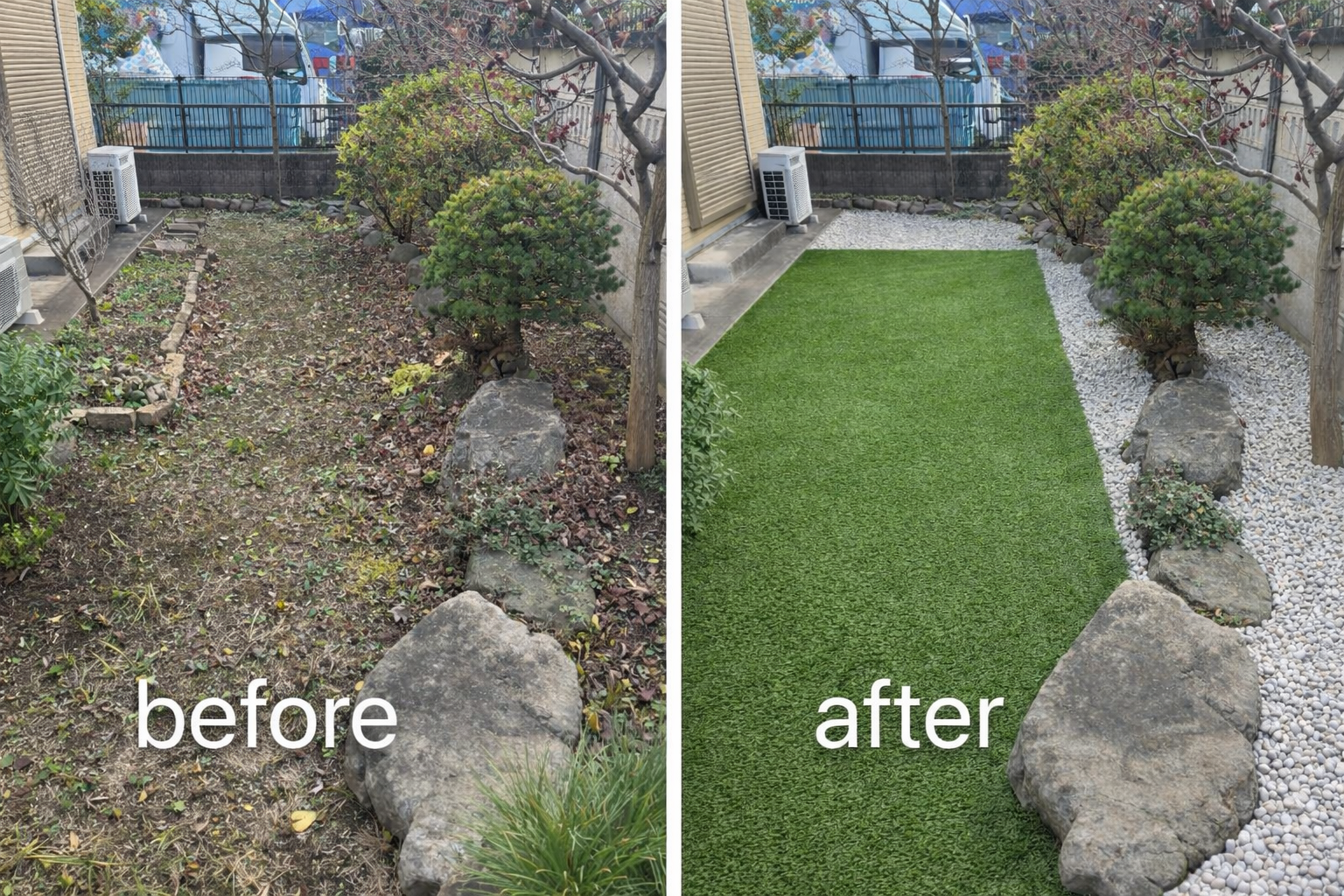 防草施工をして人工芝施工と砂利敷き